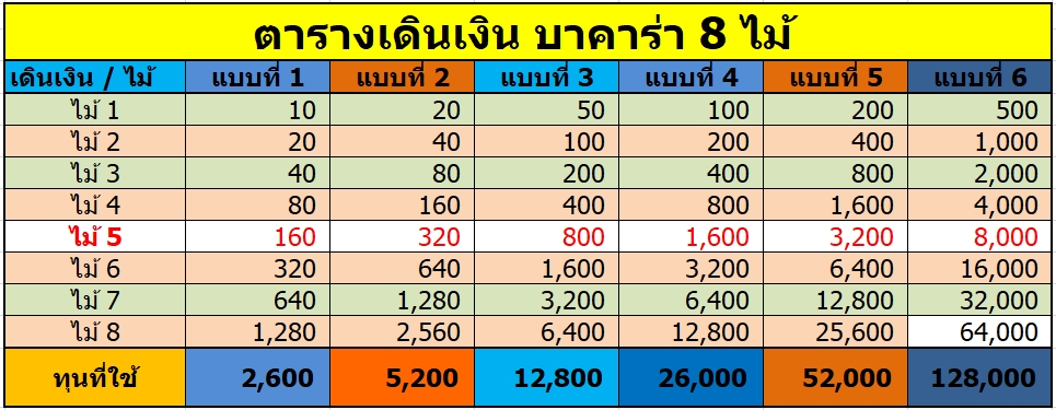 ตารางเดินเงิน 8 ไม้ เหมาะสำหรับผู้เล่นที่ต้องการเดิมพันในแบบฉบับนักลงทุน ลดความเสี่ยงในการแพ้ระยะยาว ซึ่งจากสถิติผู้เล่นที่ใช้แบบแผนเดินเงินทบ จะมีอัตราการชนะสูงกว่าผู้เล่นทั่วไป รวมถึงหากใช้กับสูตรช่วยเล่น ก็จะเพิ่มโอกาสชนะได้มากขึ้นถึง 99%